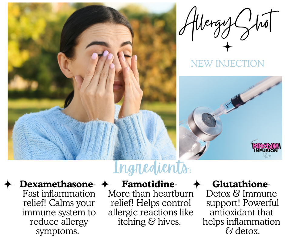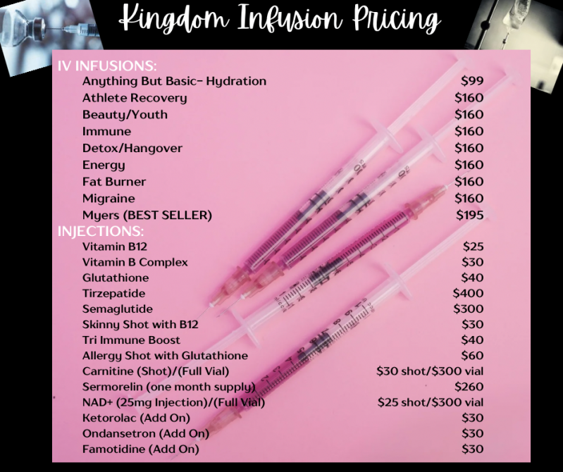 Discover Kingdom Infusion's core services, designed to enhance your wellness journey. We offer IV Vitamin Infusions, IV Hydration, B12 Injections, B-Complex Injections, Allergy Shots, Skinny Shots, Immune shots, GLP-1, and NAD+ to boost your energy and overall health. Experience the convenience of our mobile service – we come to you!